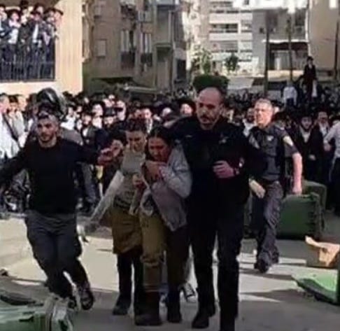Two IDF female soldiers hustled from a mob of rioting Haredim by police