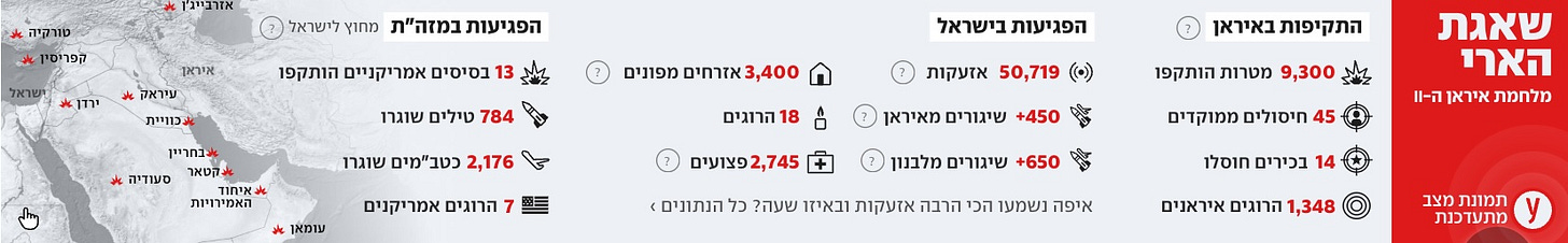 However, neither seems deterred. According to Ynetnews, the IDF has hit 9,300 targets in Iran, 59 leaders killed, nearly 1,500 killed.
