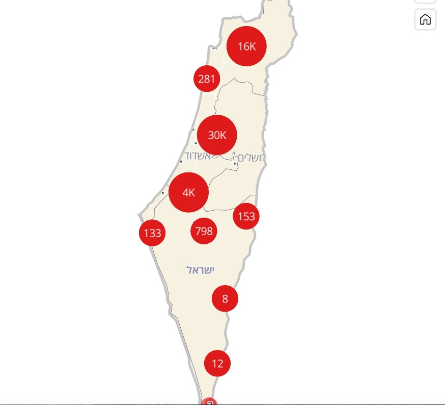The most frequent attacks took place between 10am to 16:00 pm. 30,000 of the sirens were in the Dan region.