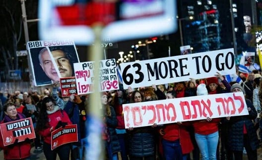 Demonstration in Tel Aviv calling for release of 63 remaining hostages