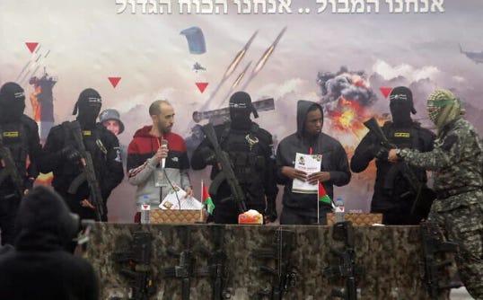 According to the Times of Israel, terrorists who were freed from Israeli prisons in the cease-fire agreement were present at the Hamas "ceremony" to release the bodies of dead Israeli hostages.